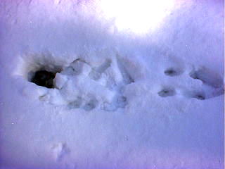 新雪が降った翌朝、森の中を歩いていると、キツネやウサギ、エゾリスなどの足跡を見つけることが出来ます。ウサギの足跡に天敵のキツネの足跡が交差していたり、平行に歩いた跡があったりするので、時間差とはいえ、とっても不思議な気持ちになります。また、いままで見たことも無い、自分の知らない形の足跡があると、いろいろ想像力を働かせて考えるのですが結局解りません。